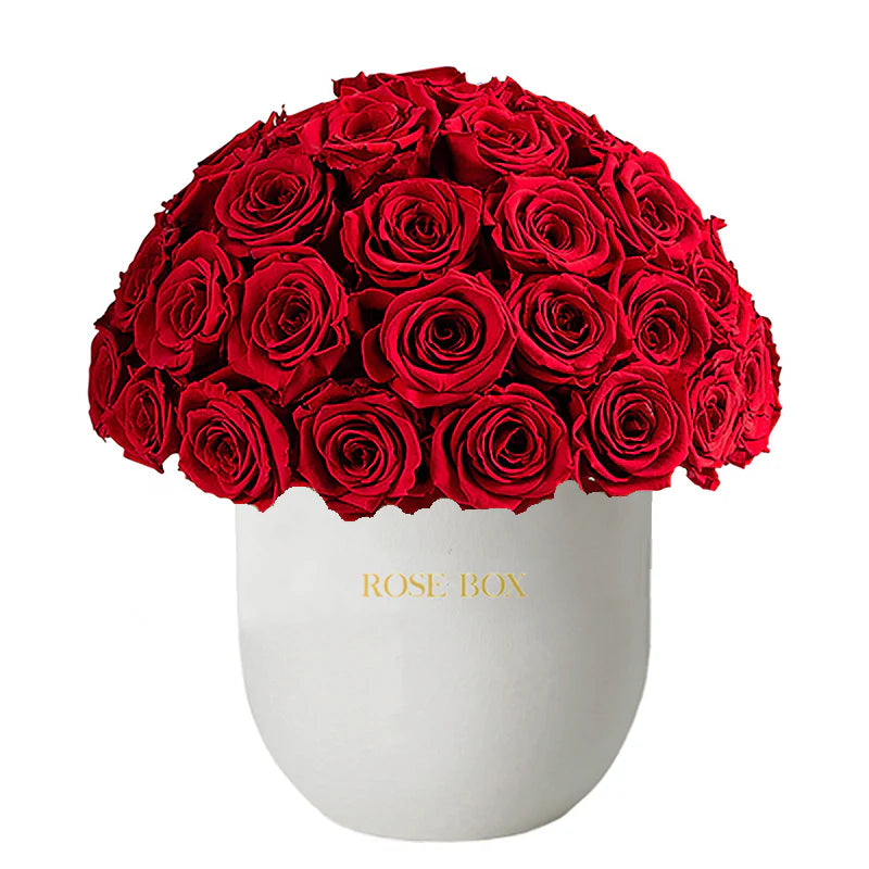 Introducing the Ceramic Classic Half Ball - a unique and stylish gift for any occasion. This stunning half ball vase is made with a high-quality ceramic material and contains 55 XL Long Lasting preserved roses in a vibrant color of your choice. The ceramic material gives the vase a classic and timeless look, while the preserved roses bring a pop of color and life.
